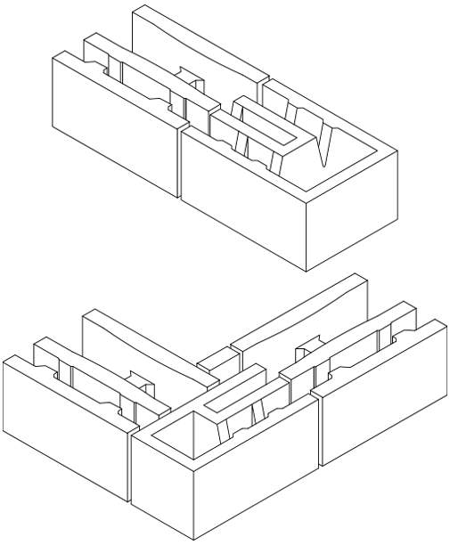 Corners may be constructed with the System 8 Left and Right Corner units, or standard 8x8x16 CMU if required for additional reinforcement and grout. Likewise, jamb or end-wall conditions may utilize the Jamb unit or 12x8x16 standard CMU.