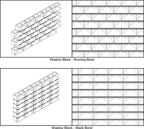 Featuring an angular, beveled projection, Shadow Block creates strong course definitions with a diamond-cut design on its face.