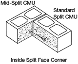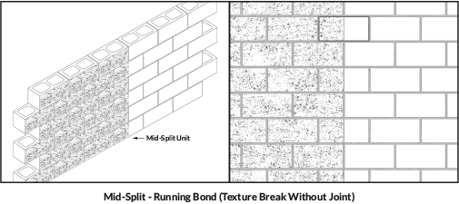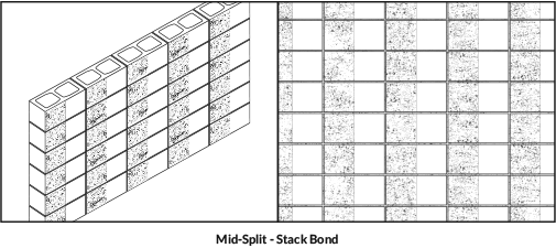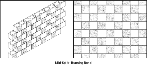 Used as a field, a running bond installation creates a checkerboard pattern; in stack bond, vertical striations. Inserted in a field of typical precision or split face units, the Mid-Split can add accents at random, or in phasing patterns. This unit can also facilitate clean inside corners for split textured walls.