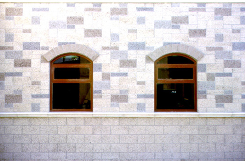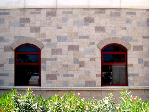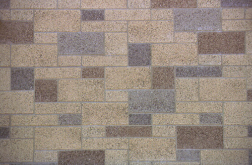 A unique ashlar design with multiple colors and a sandblast finish of precision units in Natural Gray, Charcoal, Slate, and Sienna Brown.