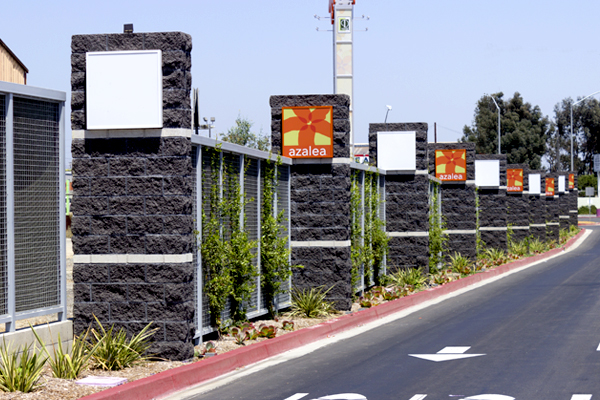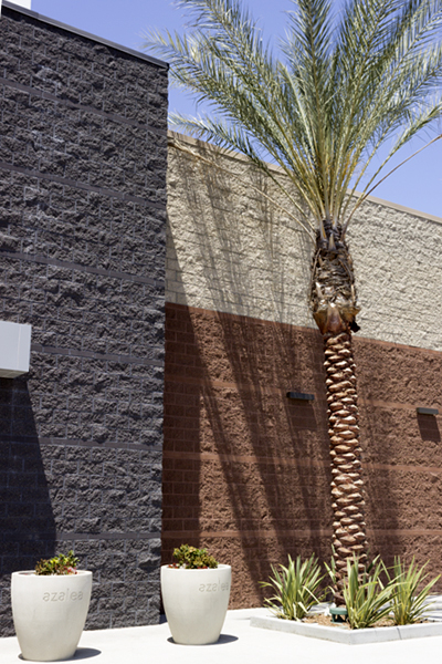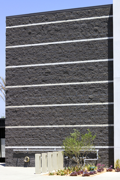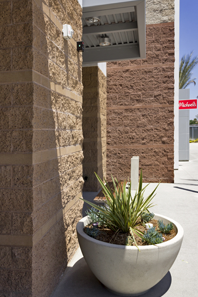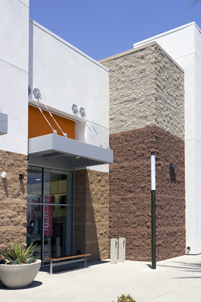 The design of this new major shopping center takes advantage of concrete masonry’s modular construction, incorporating contrasting fields and bands with texture and color. Included are Midnight Split Face, 4-in high Midnight Precision, Sienna Brown Split Face, 4-in high Sienna Brown Precision, Harvest Split Face, 4-in high Harvest Precision, Natural Gray Split Face, and Glacier White 4-in high Precision.