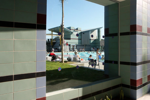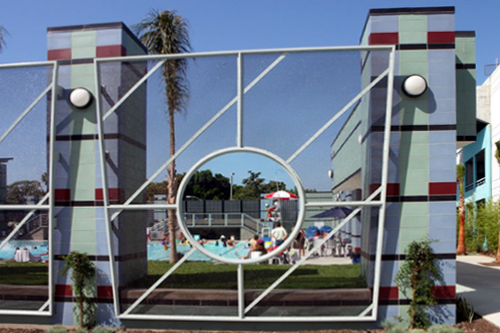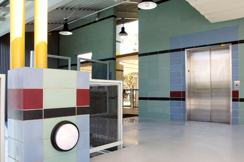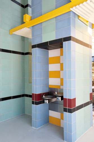 Glazed CMU is used throughout, with multiple colors, shapes, sizes, and heights.