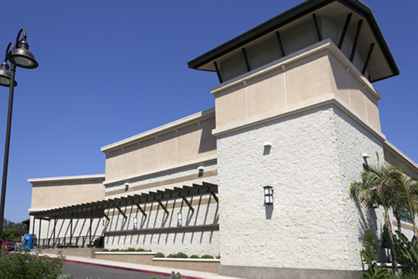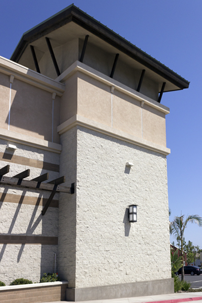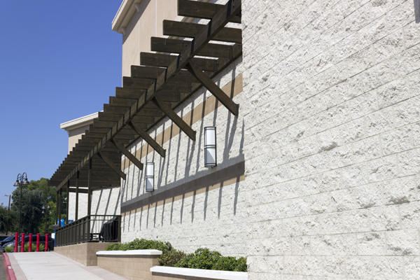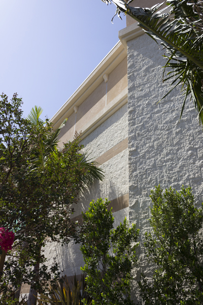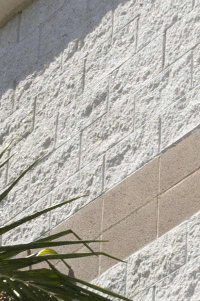A beautifully designed structure on a non-rectangular site. The exterior palette includes Glacier White Split Face fields, Shoreline Precision bands, and Redbrick Split Face accents.