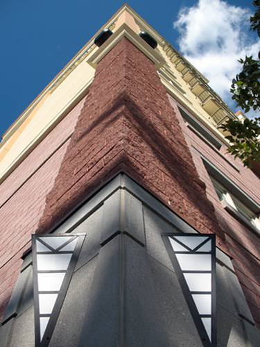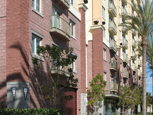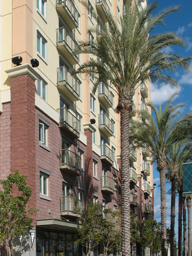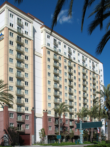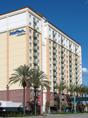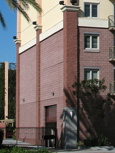 Sienna Brown in Burnished fields with Split Face columns anchor the lower floors of this time-share establishment in the Anaheim Resort district.