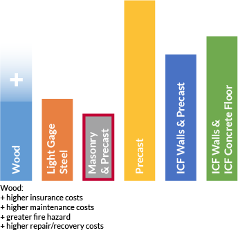 The study considered a multi-residential building and calculated costs of various structural systems that could be used in its construction. Concrete masonry and precast floor systems have always compared favorably to wood, but the masonry system provides superior resilience and fire compartmentation. Wood systems are inherently at risk. Thus, the long-term costs of wood in maintenance and insurance are considerably higher.