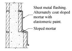 Most clear water repellent treatments are not designed to resist water penetration on horizontal masonry surfaces. Accordingly, ledges formed by projecting units out beyond the face of the wall should be either flashed with sheet metal or patched with an elastomeric coating (see Figure 1).