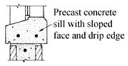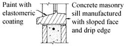 Dense, precast concrete sills, properly sloped and with drip edges, can provide an acceptable sill condition (see Figure 2). Masonry unit sills should also be coated with an elastomeric coating. Avoid mortar sills since they are porous and crack. If used, they should be covered with flashing or coated with an elastomeric coating to prevent water.