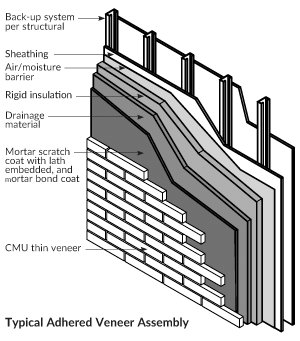 Note: The illustrations herein are very generalized and may not account for conditions and requirements specific to your project. Adhered veneer is not a proprietary, cmu-specific installation, but is governed by building codes. Cmu is simple and straightforward in its installation. However, other materials and layers as required for the project may be manufacturer-specific in their installation. Therefore, we recommend obtaining details and assistance from manufacturers of such specified items.