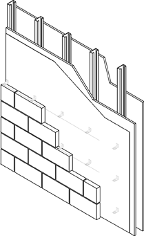 A common veneer system consists of (from inside out) the structural back-up (studs and plywood sheathing shown here), waterproof sheathing, wall ties, 1-inch min. air space, joint reinforcement, and the cmu/mortar installation.